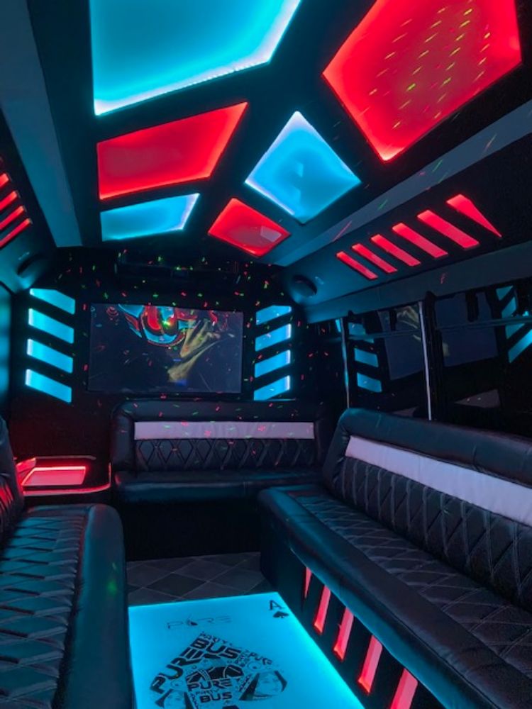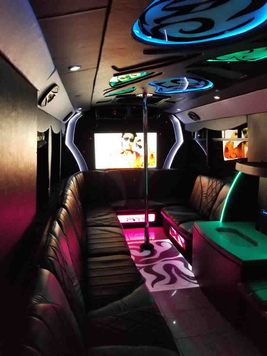 The ACE OF SPADES Is our 14 passenger party bus. It may be small but it is fully loaded with features. There is 2 Tvs, 2 touch screen 2 din radios, Karaoke, Removable dance pole, trash can, Ice chest, Parameter seating, Laser lighting, Led mood lighting, and more.