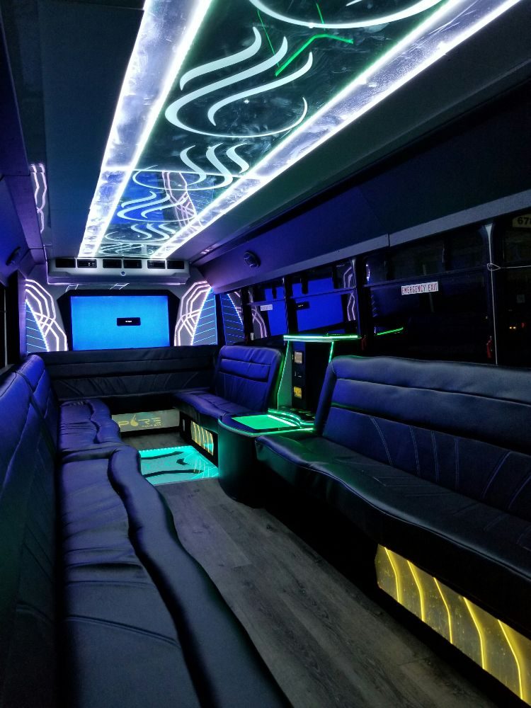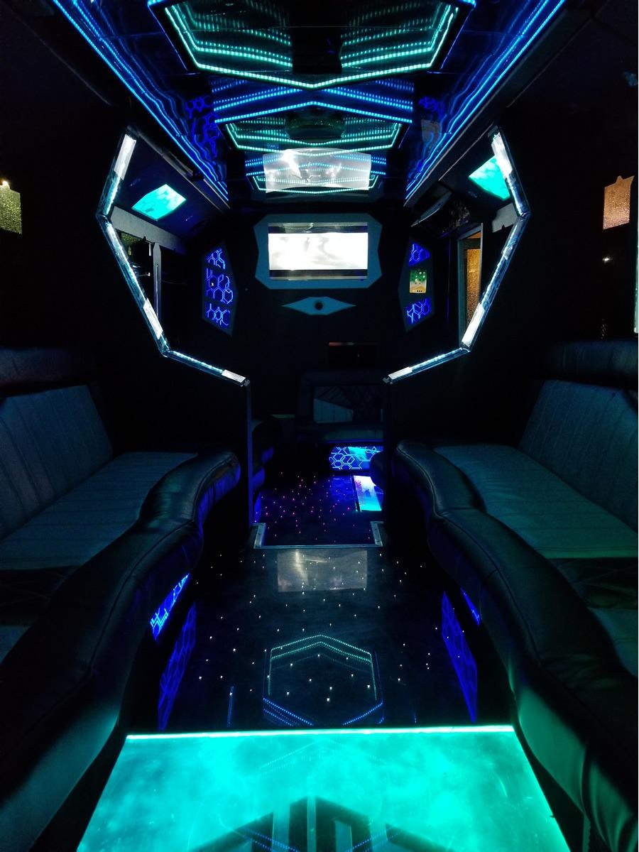 Welcome aboard AREA 51!!! This is our 34 passenger party bus that features a fog machine, a 50" and a 42" inch tv, 2 separate areas one with a high ceiling, The one and only multi-level star lit floors, infinity ceiling, led walls, a disco floor with 2 removable dance poles, privacy partition, plush perimeter seating, 2 Drink bars, cup holders, lasers, 2 double din radios, and more.....